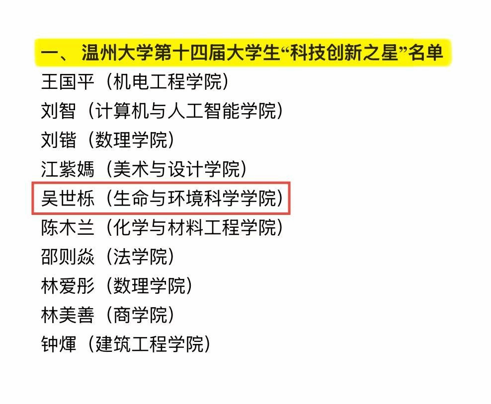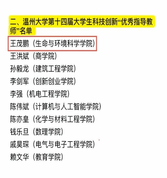 经学院推荐、专家评审、学校公示,我院王茂鹏老师获评温州大学第十四届东海潮“大学生科技创新优秀指导教师”,22生科师范2班吴世栎荣获该评选“大学生科技创新之星”。