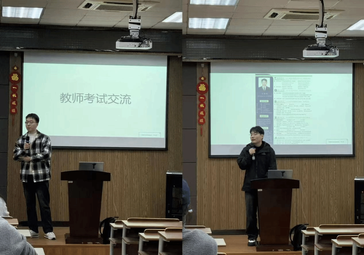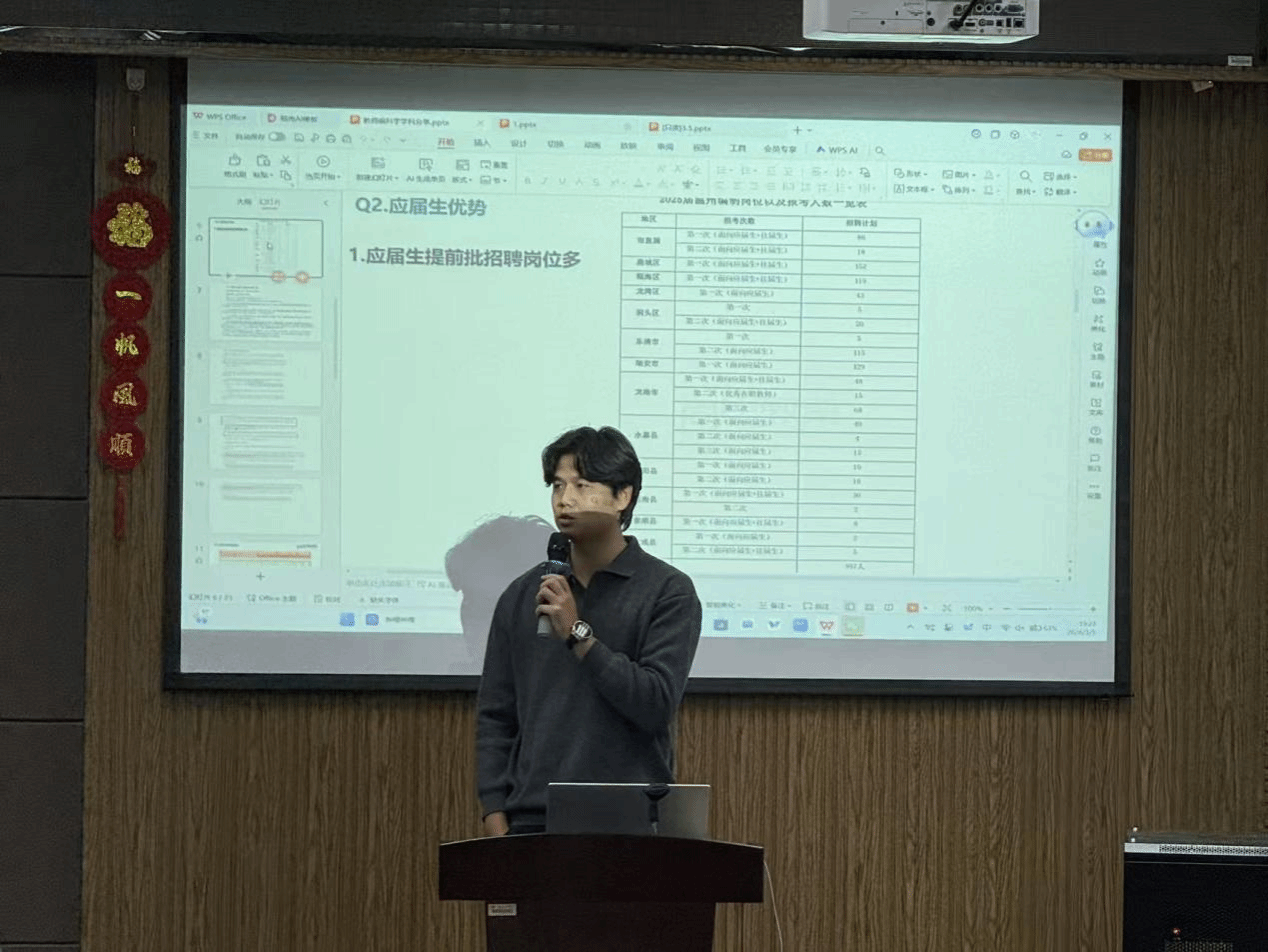 活动伊始,三位已成功通过教师提前批招聘的学长依次登台,用真实经历为同学们拨开备考迷雾。他们结合自身备考故事,从信息收集、备考方向到心态调节,毫无保留地分享了上岸“秘籍”,让在场同学频频点头。