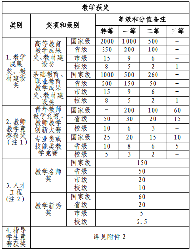1.教学建设与研究业绩计分范围包括教学获奖(教学成果奖、教材建设奖、教师教学竞赛获奖、人才工程、指导学生竞赛获奖)、教学平台、教学项目和指导学生科研项目等。除特殊说明外,计分和奖励范围为市级及以上级别的教学建设与研究业绩,校级教学建设与研究业绩只计分不奖励。