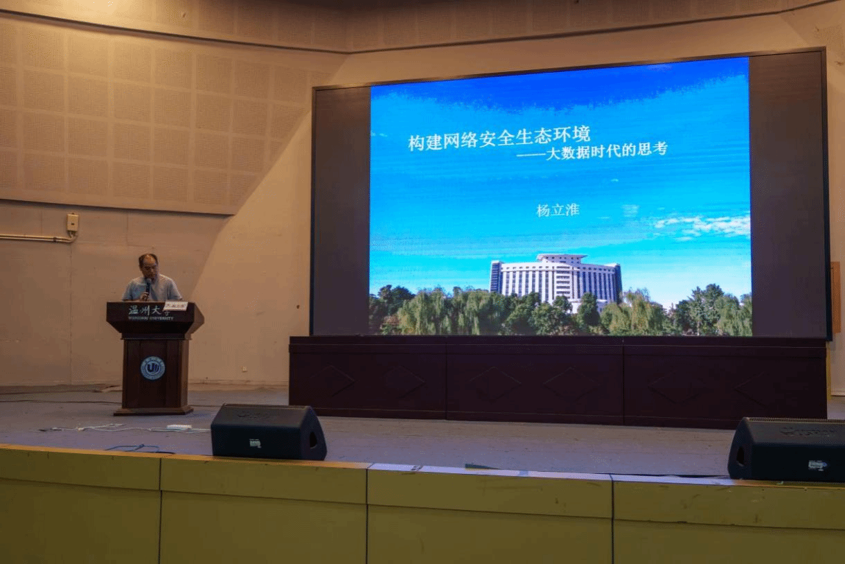 杨立淮教授以“构建网络安全生态环境——大数据时代的思考”为题展开第二场讲座。他从当前国际背景切入,剖析了中美贸易摩擦等现实形势,以明晰不知未来者无以评判当下,不知世界者无以理解中国,不知宏观者无以处理微观的观点。