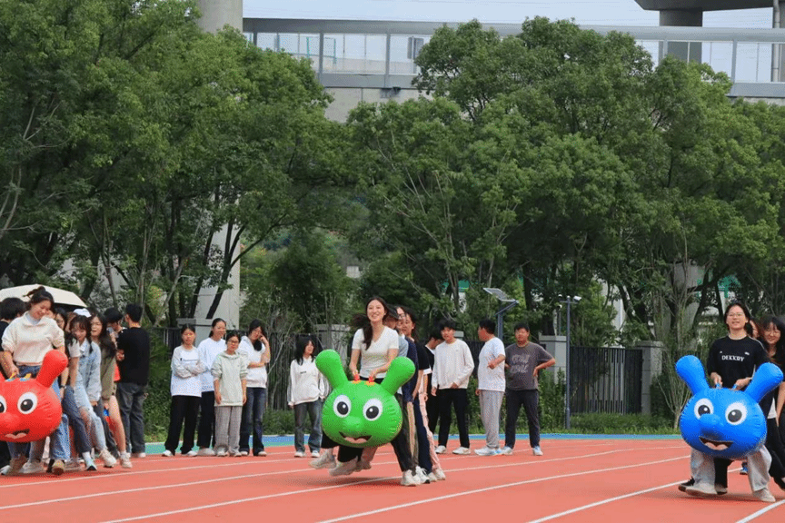 开幕式后,趣味运动会有序开展,赛场瞬间被热情点燃:两人三足的队员脚绑脚、步同步,默契搀扶着稳步向前;毛毛虫项目中,同学们齐喊号子,步伐一致地向终点冲刺;集体八字跳长绳飞速轮转,选手们踩着节奏轻盈穿梭;在20×50接力赛上,接力棒的传递串联起速度与期盼;压轴的拔河比赛里,队员们紧握长绳、聚力相持,每一份坚持都凝聚着团队必胜的信念,各项比拼中尽显蓬勃活力与奋进姿态。