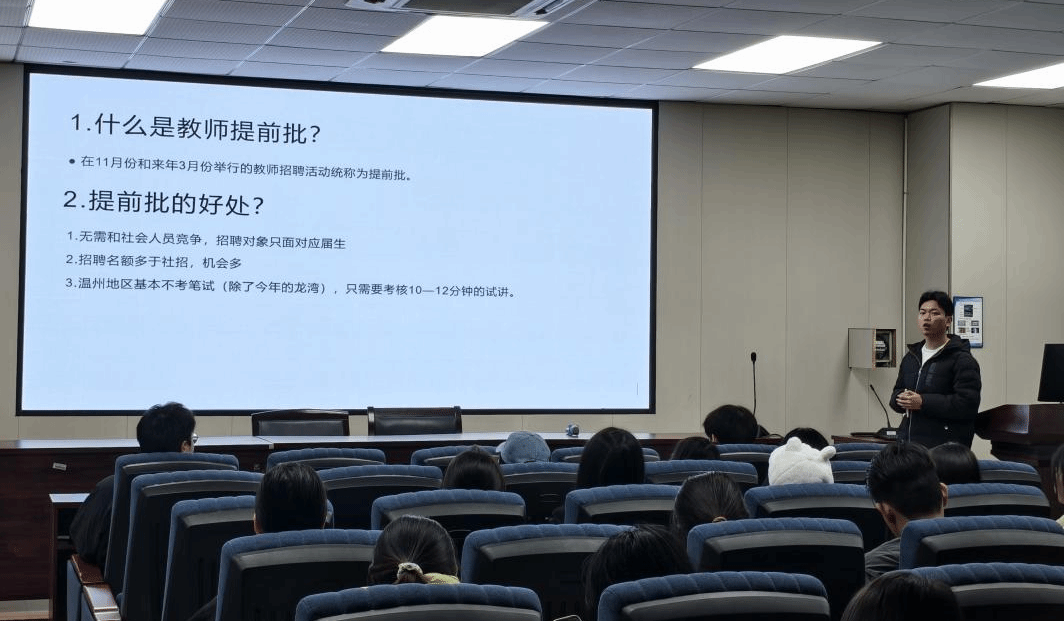 分享会上,学长学姐们结合不同地区、学段的应聘经历,从多个维度梳理了备考要点。在备考规划方面,他们建议同学们尽早明确目标学段和地区,合理规划时间、分阶段复习;在面试试讲环节,大家一致强调了课程逻辑、互动设计和板书规范的重要性,并提醒注意控制节奏、展现教师仪态;在心态调整方面,学长学姐分享了应对紧张情绪、化解突发状况的实用方法。此外,他们还就温州、宁波、杭州等地的考情差异、面试侧重点进行了对比分析,为在场有志于投身教育行业的同学们提供了真实、可借鉴的面试通关指南。现场交流踊跃,氛围热烈。