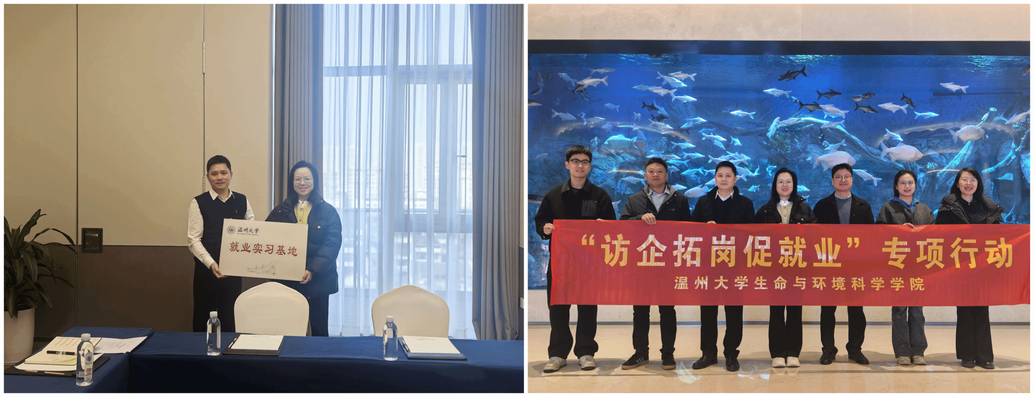 3月10日,学院党委书记李祖祥、党委副书记周领带领学工办辅导员走访另一家教育部名录企业——温州极地海洋世界有限公司。温州极地海洋世界总经理陈汝俊、温州新文旅集团人资部经理王春丽等参与接待。此前,学院与极地海洋世界已在学生社会实践、科普教育等方面建立良好合作基础。此次走访,双方重点围绕生物、生态类人才的联合培养与输送展开洽谈。企业方表示,其运营管理、动物保育、科普教育等岗位与我院生物科学、生物技术、生态学等专业匹配度极高,目前虽以社会招聘为主,但非常期待与学院深化合作,共同探索校园招聘、订单式培养等新路径,吸引更多优秀毕业生加盟。此次走访进一步巩固了校企关系,双方现场签署协议,授予温州极地海洋世界“就业实习基地”牌匾。