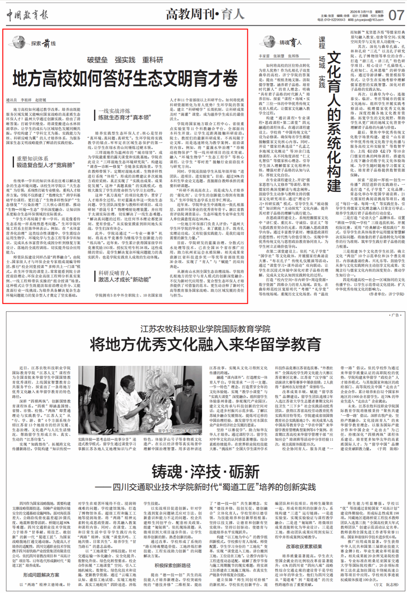 (通讯员 李祖祥 赵舒展)地方高校如何通过教学改革,培养出既能服务区域发展又能响应国家战略的高素质生态环保人才?温州大学通过创新实践,给出了清晰答案:打破学科壁垒,将课堂搬进山水林田湖草沙,让学生的成长与区域绿色发展同频共振。学校构建了“学科交叉为基、实践能力为核、科研反哺为翼”的人才培养体系,为服务国家生态文明战略提供了鲜活的实践经验。