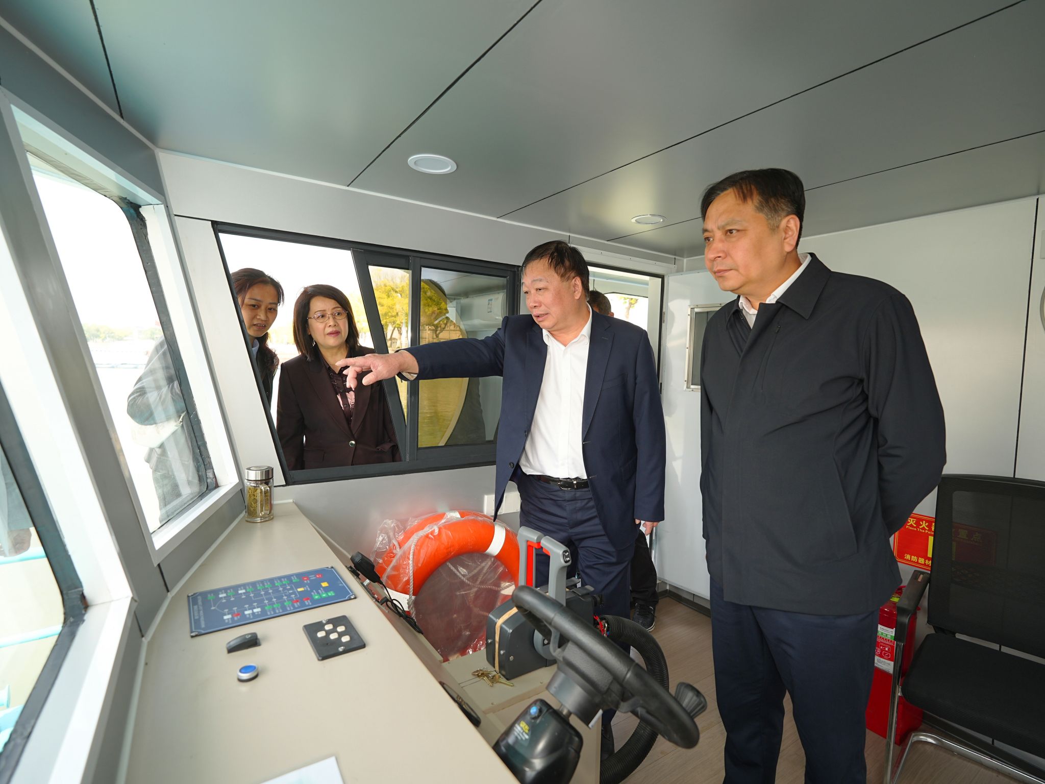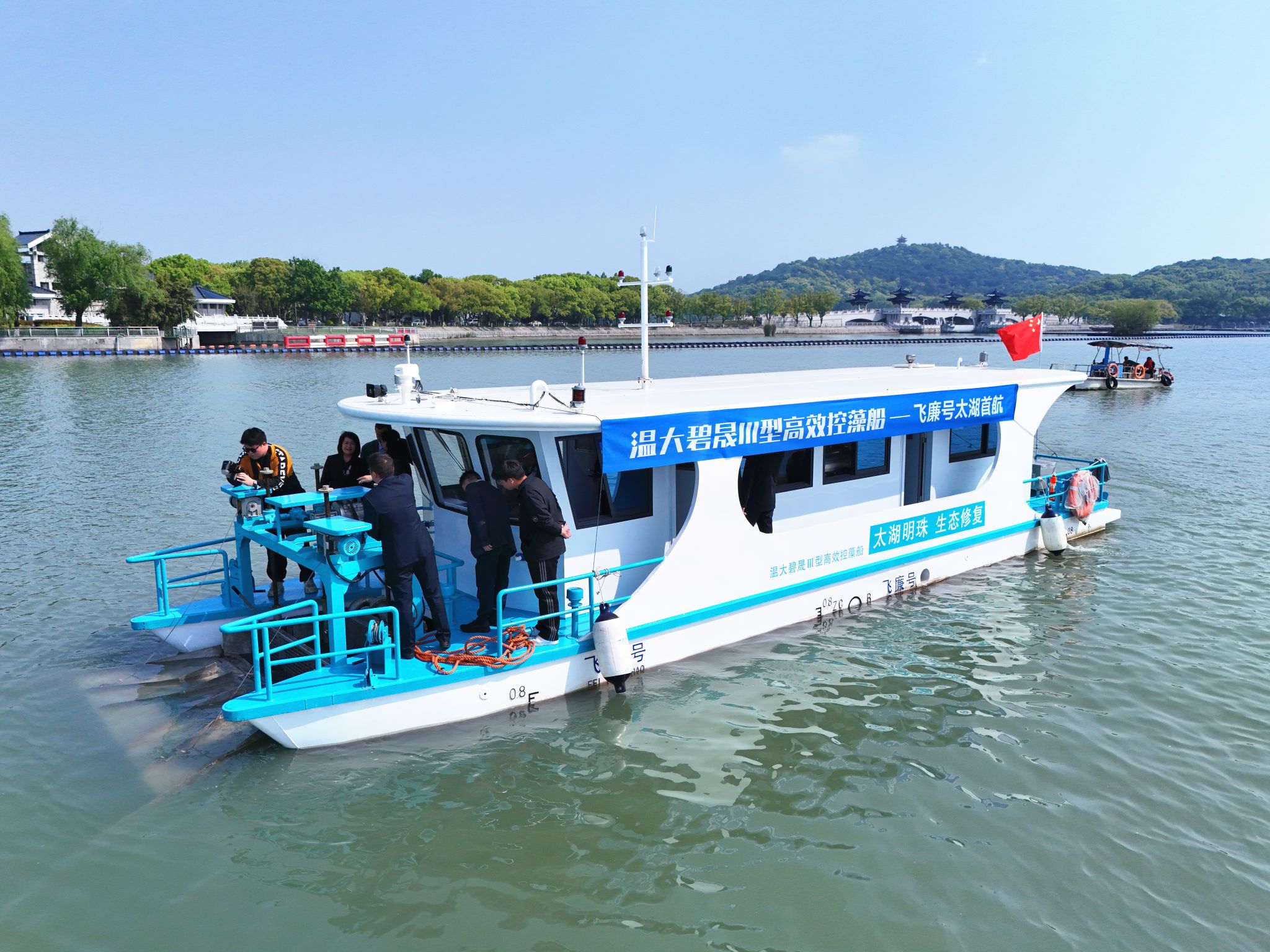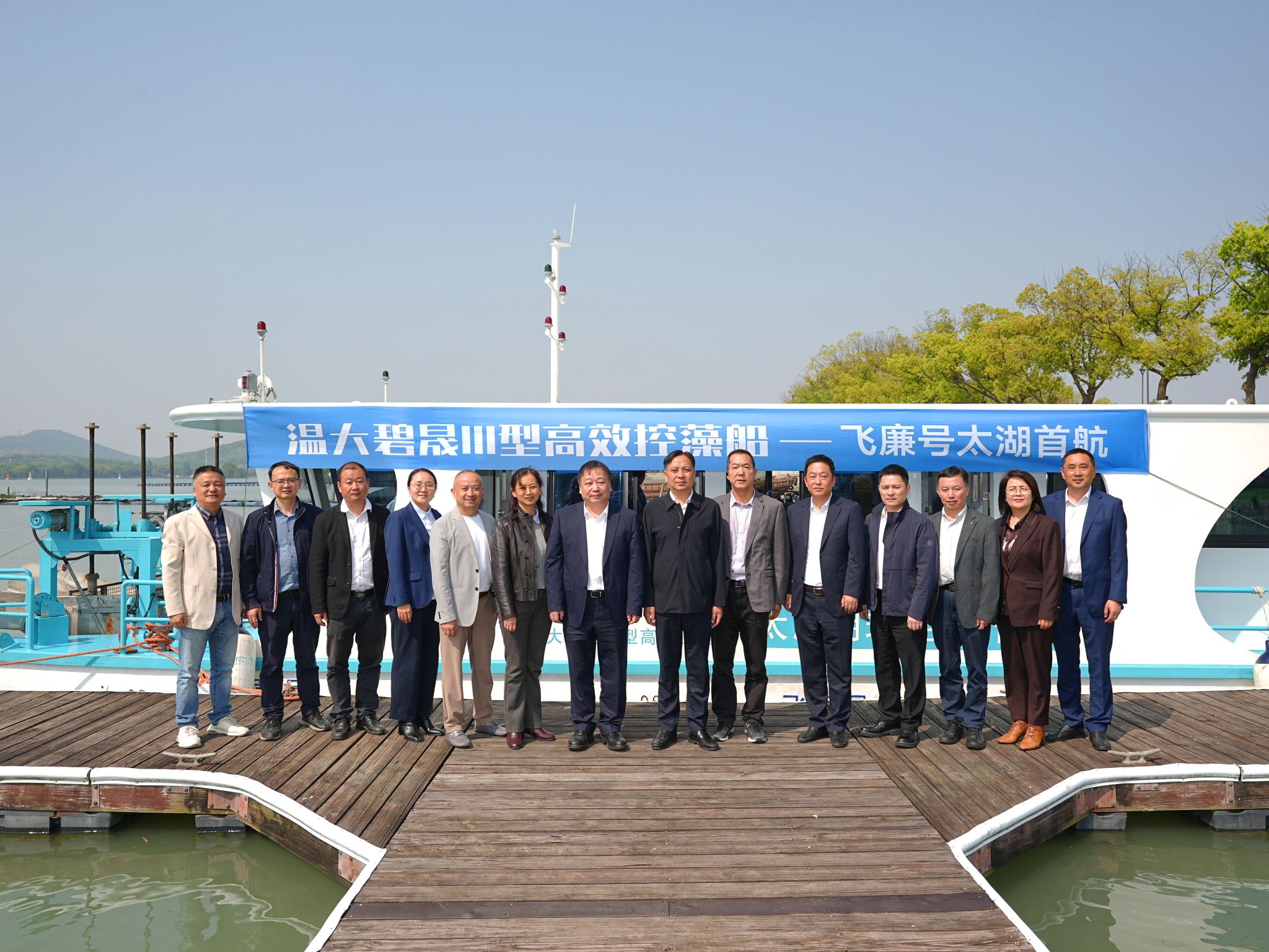 4月24日,由温州大学校长赵敏教授领衔科研团队自主研发的蓝藻水华物理喷射分散技术迭代成果温大碧晟Ⅲ型高效控藻船“飞廉号”,在太湖鼋头渚举行交付首航暨产品发布会,正式投入太湖流域蓝藻水华常态化应急防控与综合治理工作。仪式由温州大学与无锡市文旅集团联合主办,温州大学赵敏校长及研发核心团队、无锡市生态环境局、水利主管部门、浙江伟达园林工程有限公司等有关单位领导、行业专家共同出席见证。
