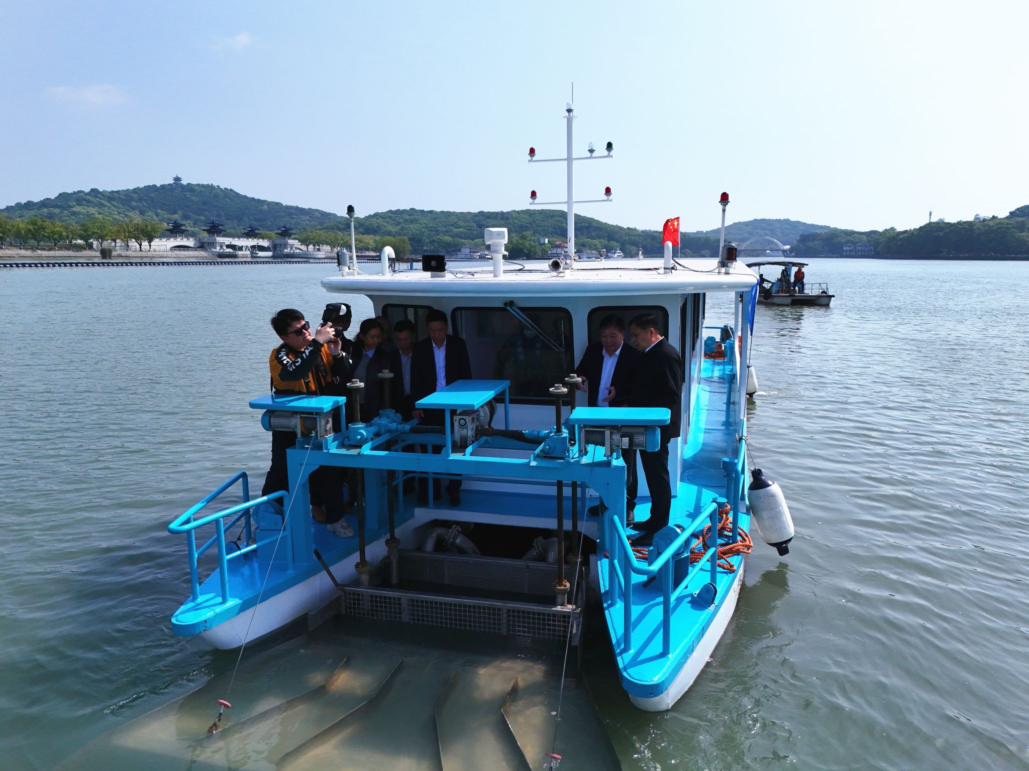 “飞廉号”作为温大碧晟Ⅲ型旗舰控藻船,此次成功在太湖落地投用,标志着我国物理原位生态控藻核心技术,正式迈入产业化落地、规模化应用、标准化推广的全新发展阶段,为湖泊富营养化治理领域科技成果转化树立标杆。在太湖首航仪式现场,赵敏教授指出,“温大碧晟Ⅲ型高效控藻船‘飞廉号’ 是高校基础研究、技术创新、产业落地、社会服务产学研用深度融合的典型示范成果。控藻船的规模化投运,将全面强化太湖流域蓝藻应急处置与常态化管控能力,为太湖安全度夏、流域水生态稳定维系提供绿色高效、经济可持续的硬核科技支撑,有力推动区域富营养化水体综合治理体系提质升级,筑牢区域水环境安全屏障。”