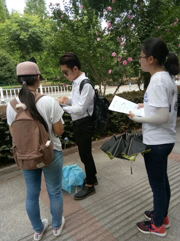 骄阳似火,队员们顶着炎热的夏日,在街上向行人发宣传单宣传自闭症知识,每一个驻足的行人都认真听着队员们的讲解及翻阅宣传单。队员们手中的宣传单一点点地变少,汗水在他们脸上滑落,但他们的心也一点点的变得更加充实。大学城的各个角落里都有我们队员发放问卷的身影,无论是茶山镇上还是商务中心里。路人行色匆匆,不少人都拒绝进行问卷调查,但我们的队员们并不气馁,继续前行寻找着做问卷的行人。水果店的老板、保安大叔、头发花白的老人、学生,无关年龄,无关职业,每一个都是队员调查的对象,希望将自闭症传播出去,让更多的人了解和自闭症。
