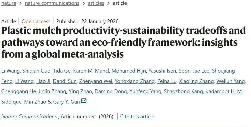 近日,我院甘延太院士团队联合多个国家的科研机构在国际权威期刊《Nature Communications》在线发表了题为“Plastic mulch productivity-sustainability tradeoffs and pathways toward an eco-friendly framework: insights from a global meta-analysis”的研究论文。该研究基于全球尺度的系统性证据,深入揭示了塑料农膜在提升农业生产力与引发环境风险之间的权衡关系,明确提出了破解“生产力—可持续性悖论”的关键优先事项与可行路径,为全球塑料污染治理和农业绿色转型提供了重要科学支撑。