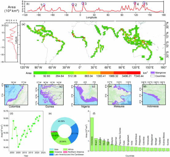 研究利用2000-2022年的全球红树林分布时间序列数据集,刻画了红树林增减的时空格局,并运用机器学习模型在全球和区域尺度上识别关键驱动因素。结果表明,2000-2022年间,全球红树林面积总体略有增加,但区域差异显著。东南亚地区经历了显著的面积减少,而南亚、非洲和大洋洲则普遍呈现增长趋势。与全球模型相比,区域模型展现出更优的预测能力(R²高达0.8949),强调了海岸线可达性、保护区状况和农业适宜性等局部驱动因素的影响。相似区域内红树林增减并存的现象凸显了生态系统动态的复杂性和非线性特征。发现有助于我们理解红树林变化机制,并为制定全球范围内有针对性的保护和气候适应战略提供关键信息。