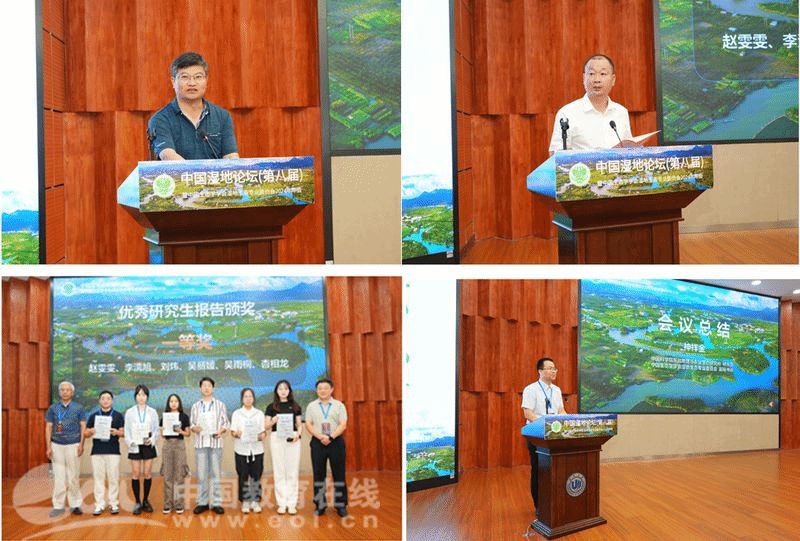 闭幕式环节由温州大学生命与环境科学学院副院长陈斌斌主持,温州大学生命与环境科学学院院长郑向勇教授宣布了获得优秀研究生报告奖名单,本次大会共有6个研究生报告获得一等奖,12个研究生报告获得二等奖,18个研究生报告获得三等奖。中国生态学学会湿地生态专业委员会副秘书长、东北地理所神祥金研究员对本次大会进行了总结,并宣布第九届中国湿地论坛举办地在湖南省长沙市,主办方为中国科学院亚热带农业生态研究所。中国科学院亚热带农业生态研究所李峰研究员代表下一届中国湿地论坛主办方发言。