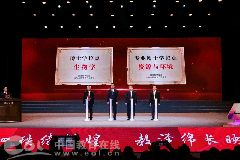 温州大学党委书记钱强、校长赵敏和中国科学院院士金振民、加拿大皇家科学院院士甘延太共同为新增博士学位点揭牌。