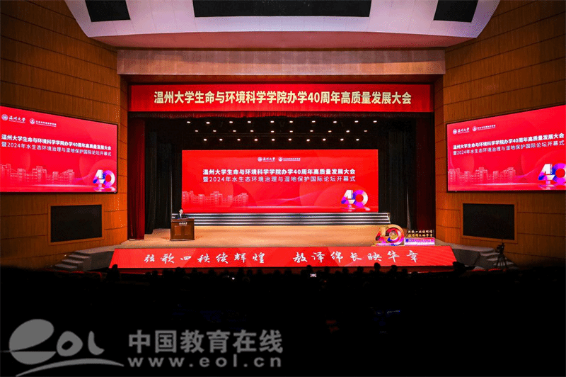 中国教育在线浙江站讯 (记者 陈显婷 通讯员 温大萱)四秩芳华,弦歌不辍。近日,为全面回顾四十年发展历程,总结办学经验,展望未来发展蓝图,凝聚共识,推动学院在新的历史起点上实现更高质量的发展,温州大学生命与环境科学学院(下简称“温大生环学院”)举行办学40周年高质量发展大会暨2024年水生态环境治理与湿地保护国际论坛开幕式。