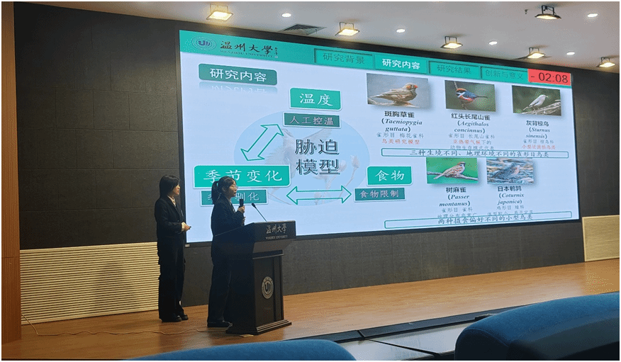 从实验室的机理探索到保护区的生命守护,团队不断创新科研方法,应对生态挑战。团队负责人徐铭茹回忆道:“高温天路边坠落的鸟,让我们意识到气候变化已逼至眼前。”不同于传统单一物种研究,他们创新性地将红头长尾山雀、日本鹌鹑等5类生态位迥异的鸟类纳入同一框架,凌晨三点记录代谢率、春节分析基因数据成为常态。首创的“三维胁迫模型”揭示了嘌呤循环在鸟类冷适应中的新机制,而“代谢表型弹性阈值”理论更为保护区规划提供了精准坐标。“这些成果正在转化为乌岩岭的保护实践。”指导老师闻靖表示。