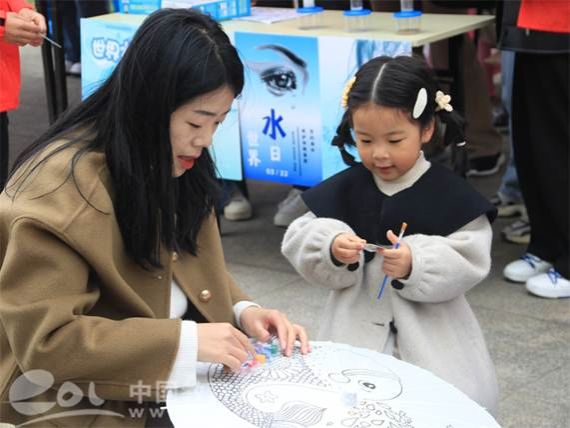 一笔一划描绘出了水图的点点原貌,油纸伞绘制区域充满了此起彼伏的刷刷声,“妈妈,这个地方画成黄色更好看”,市民们用彩笔绘制着自己心中的绿水青山。另一边,水专业相关的研究生正在通过仪器设备对湿地内的水进行取样检测,学生们用烧杯盛装着生命之源,向市民科普水质标准。