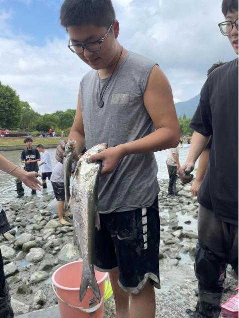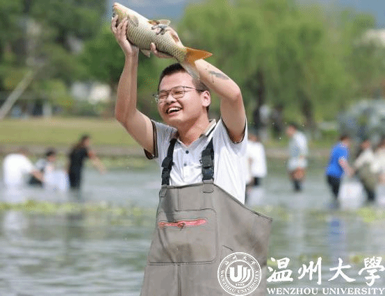 当时它自己游到我的面前,我用身体一下子压住它,勉为其难地抓到了。”来自温州大学数理学院的章奕同学向大家讲述着抓住这条重达2.4斤“鱼王”的经历。