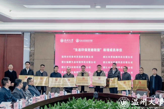 近年来,生环学院一直致力于充分发挥高校学科与人才优势,成立以服务地方、服务产业为主要导向的“生态环保党建联盟”。自2021年温州市环境科学学会、温州市生态园管委会、浙江中蓝环境科技公司、浙江中环检测科技有限公司等四家单位支持加入该联盟以来,本次又有10家企业响应加入,使得联盟成员扩员至15家。大会为新增成员单位代表授牌,并聘请联盟中12家企业的11位行业专家担任学院人才培养企业导师,同时选派党员博士驻企,进一步强化双向互动,为企业发展赋能。