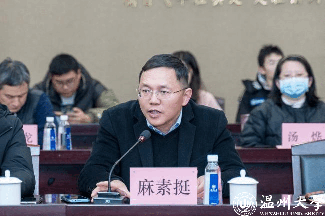 温州市生态环境局副局长麻素挺致辞。他肯定了温州大学近年来在学科建设、人才培养、科学研究和社会服务等方面取得的成绩,尤其在建立生态环保联盟、校企专业互聘、校企合作项目等强化党建引领产学研协同和服务地方工作领域做出的突出贡献。他就如何推进生态文明建设和治理创新提出了三点期望:一要进一步做实生态环保党建联盟,充分释放协同效应;二要深化产学研合作,加快科技成果的推广应用;三要健全校企地联合协作的管理机制,形成工作常态化、成果可持续的良好局面,为生态环境可持续发展事业作出更大贡献。