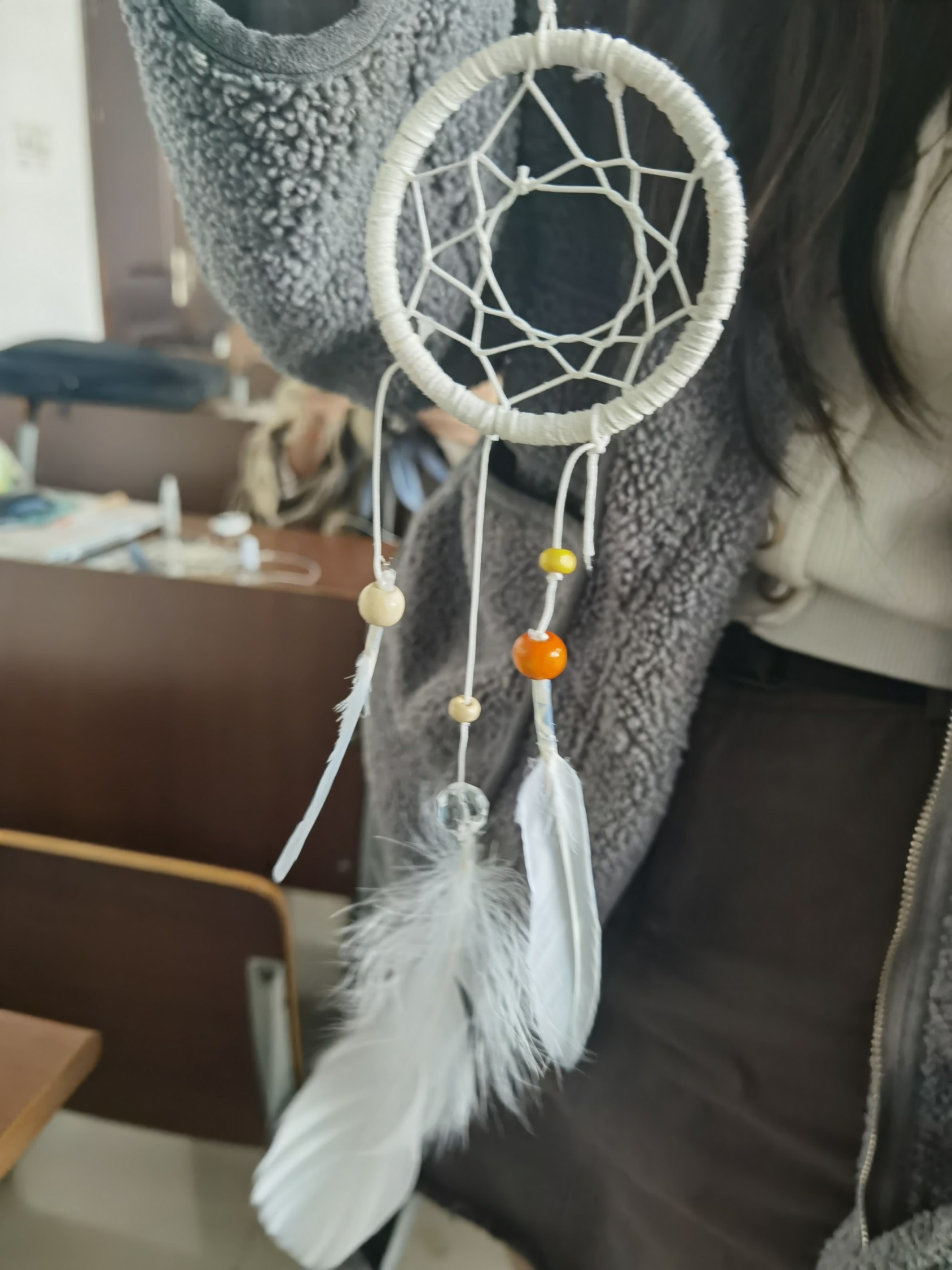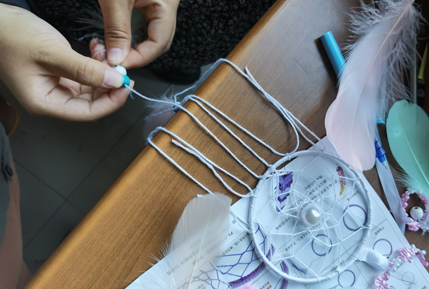 14:00,社员们在11号楼a204集合,正式开始了此次活动。活动前会长早已贴心地为大家准备了教学视频与教学步骤,并分配了制作材料。制作捕梦网所需的材料较多、步骤较复杂,许多同学在起步时都有些不知所措。但在视频的指引与会长的耐心指导下,大家都静下心来开始逐步探索制作,小心地缠绕着绒绳,细心地编织着网,慢慢的,沉浸于欢乐之中。随着时间的流逝,大家的捕梦网逐渐现出雏形。框架搭建完后捕梦网的制作便开始简单起来,同学们开始按照自己的喜好装饰捕梦网,大家轻声交流,互换材料,分享着制作好的捕梦网。