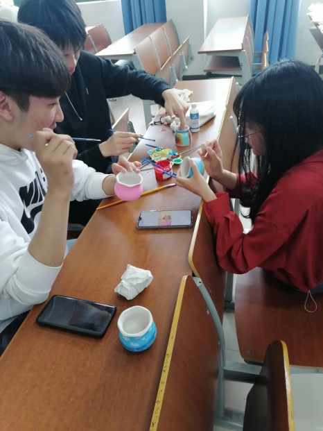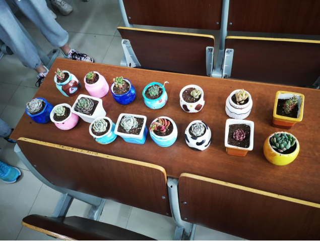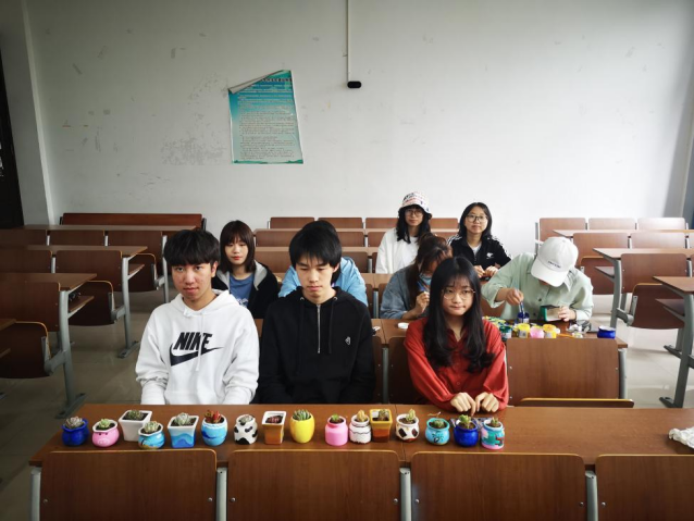 13:30左右,社团成员们在11A205教室集合,在分组入座后,活动准时开始。社员们先是亲手挑选一株多肉植物,在对形态各异的多肉精心挑选后,社员们在白纸上先为花盆设计美丽的图案。接着大家领取花盆,在社长分发完绘画材料后,社员们开始按照之前设计的图案,尽展自己的奇思妙想。蓝色、白色、绿色交织成一幅热情满满的海南沙滩图;红色、橘色、黄色汇聚成“大漠孤烟直,长河落日圆”的壮丽晚霞;无边的蓝靛色在雪白的陶瓷上展现了“天青色等烟雨”的青花瓷的魅力姿态。每一个作品都是社员想象的结晶,令人惊叹。最后,社员们拿着自己独一无二的盆栽合影留念。
