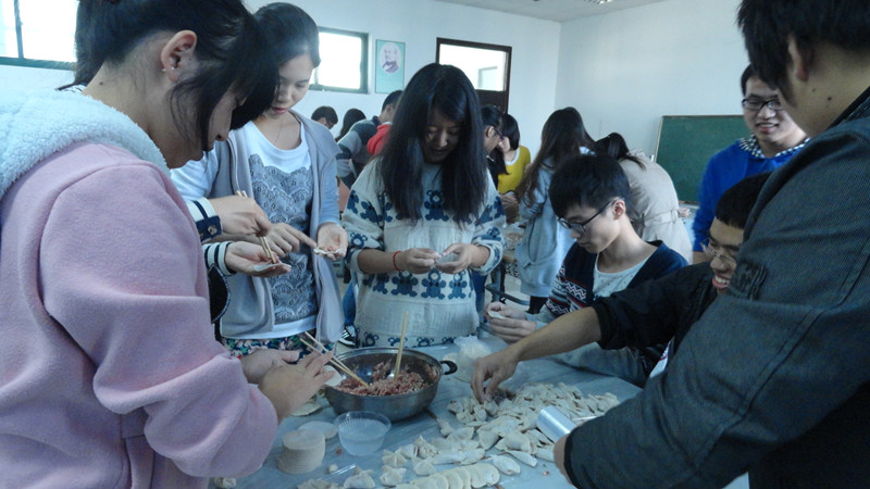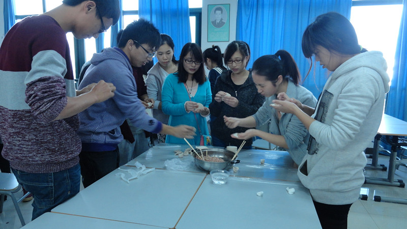 11月16日早上8:00,班委以及一些同学骑车来到茶山镇上的农贸菜市场采购包饺子需要的饺子皮,肉馅,菜和调料等食材和一些工具,为下午的活动展开做了充分的准备。下午14:00,班委先齐心协力将买来的肉和菜剁碎,做成各种口味的饺子馅,15:00,团日活动准时开始,所有同学挽起袖子,纷纷加入到包饺子的队伍中来。大家包的饺子各具特色,各种形状都有,包饺子的过程中一片欢乐的气氛。在漫长的准备过程之后,饺子下锅了。最后在大家殷切的期盼中,饺子终于出锅了。吃着自己亲自动手做的饺子,每个人都感觉特别香。空气中弥漫着的不仅仅是饺子热腾腾的香味,还有在这入冬之月暖暖的感觉。