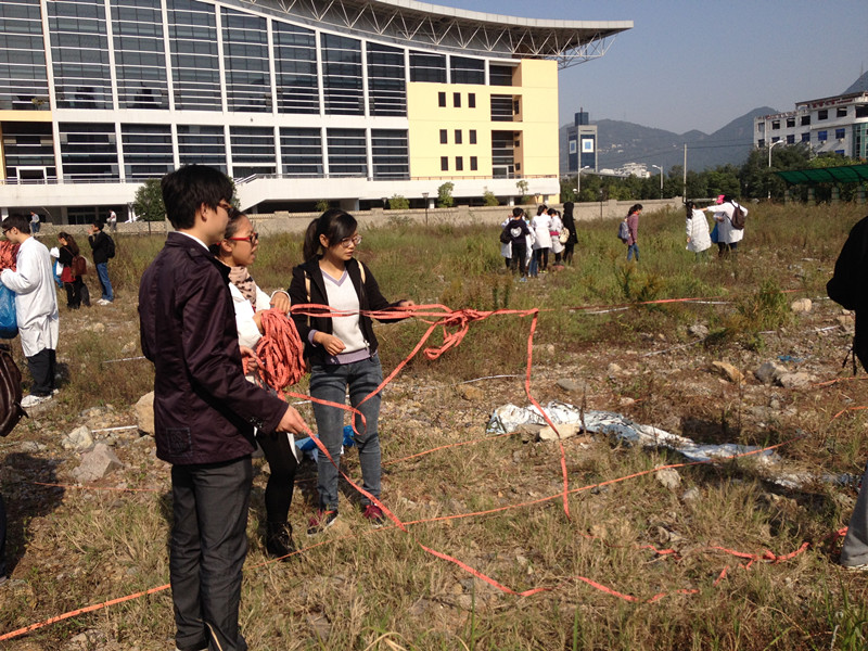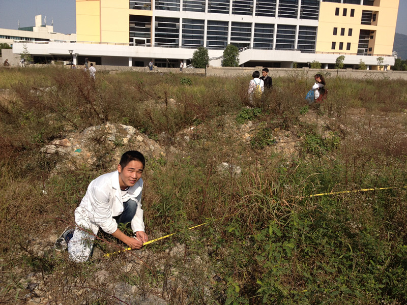 在活动开始前,几个班干部分头在大学城寻找适合的样地,并一起讨论确定下活动地点。剩余班干部被分配到去向老师借相关活动器材(卷尺、米尺、小锄头等),并申请相关的实验室做后期测量的场所。虽然过程比较麻烦,但是班干部还是顺利完成了任务。在跟全班讲这个活动之后,全班同学通过查阅文献或问相关导师主动了解关于植物生长与其生境的关系,为此活动顺利展开奠定了基础。