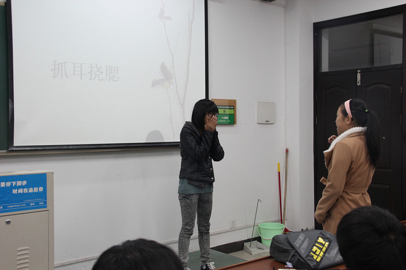 在主持人的开场讲话后,活动正式开始了。此次团日活动以小组竞赛的形式进行,最终获胜组将获得两个柚子作为奖励。分组之后各同学坐定并进行第一轮比赛——成语接龙。每组均指派一位同学在黑板上写下首尾相接的五个成语,台下各组员进行场外援助。第一轮结束后,第三组同学以绝对优势获得最高分,并赢得一阵欢呼。嬉笑过后,第二轮“心有灵犀”比赛开始了,依然由每组指派选手,要求选出两名同学默契配合,一名上台面对同学,一名背对同学对着台上的人以肢体语言描述,比赛最终计分以台上同学所猜词语个数为准,个数多者为胜。此轮比赛结束后,各组以不相上下的默契程度将比分拉平,将本次活动带入了一个小高潮。最后一轮比赛是对知识面要求极大的“一站到底”。这一环节中,主持人所提问题均新颖多样、灵活多变,最终第二组的以沉着应对和广阔的知识面赢得胜利。游戏环节结束后,主持人公布了胜利组并发放奖励。