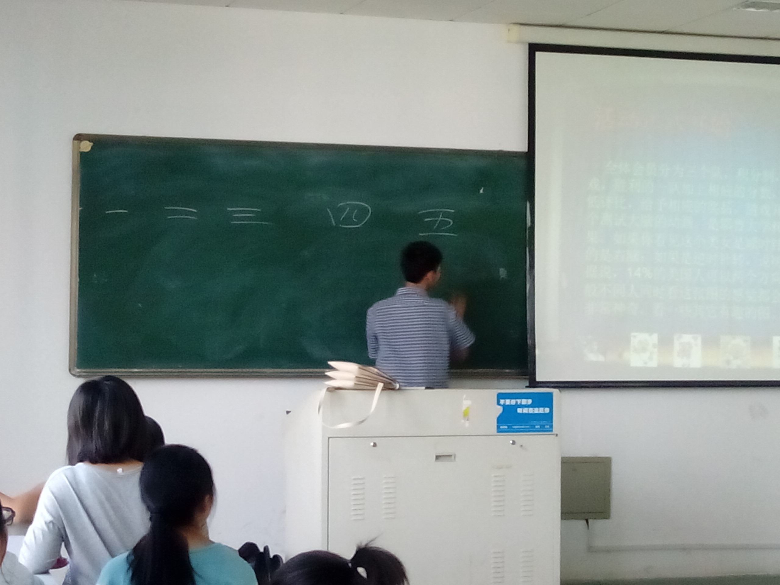 活动中,首先由副会长简述本次活动大致过程,之后将全体会员分为五个队,积分制,每个竞答或游戏胜利的一队加上相应的分数,最后以总分高低进行评比,然后给予相应的奖品。接下来播放了一个测试大脑的动画,接着就进行了智力问答游戏,游戏中会员们积极参与,对所有问题都踊跃作答。问答竞赛的题目很多,有硬币问题、猜数问题、工人金条、概率问题、镜子问题等等。游戏不仅让会员发挥了他们的智力,而且让会员在游戏中获得知识。游戏结束,其中三组获胜,副会长颁发了奖品。然后,部长沈盼盼向会员介绍我们协会及其注意的事项。之后所有部门部长介绍自己以及自己的部门及招收小干事。最后,我们向会员征求意见,让会员为我们的活动提供宝贵的意见。