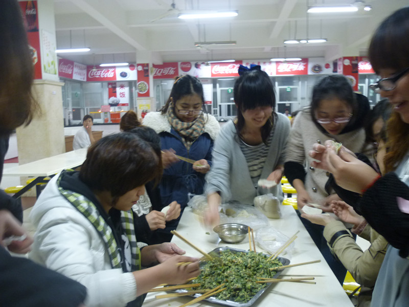 晚上六点半,同学们陆续来到食堂,一个个很自觉的去洗了手,好奇地等待活动的开始。等到各种馅料、皮子和其他材料被端上来之后,大家不用命令就自发分成三大组,七手八脚地开始包饺子。有的人水平高超,包出的饺子像超市里卖的速冻饺子一样好看;有的人还是新手,乐呵呵地包出一个三不像,自娱自乐;还有的人虚心求教,盯着身旁的高手的动作,看的那是一愣一愣的,别人一个动作,自己赶紧学着做,眼睛一定盯着看,生怕漏掉了什么过程,虽然看的很仔细,不过自己包出来的饺子依旧马马虎虎。之后便是等待水饺下锅,有的用油煎,有的用水煮,大家都一直盯着锅里的饺子,各个拿着碗和筷子,咽着口水,随时准备下手。只要热气腾腾的饺子一端出来,立马就被蜂拥而上的众人瓜分地干干净净。当然,自己亲手包出的饺子就是别有风味啊,形状也是千姿百态,奇形怪状的。