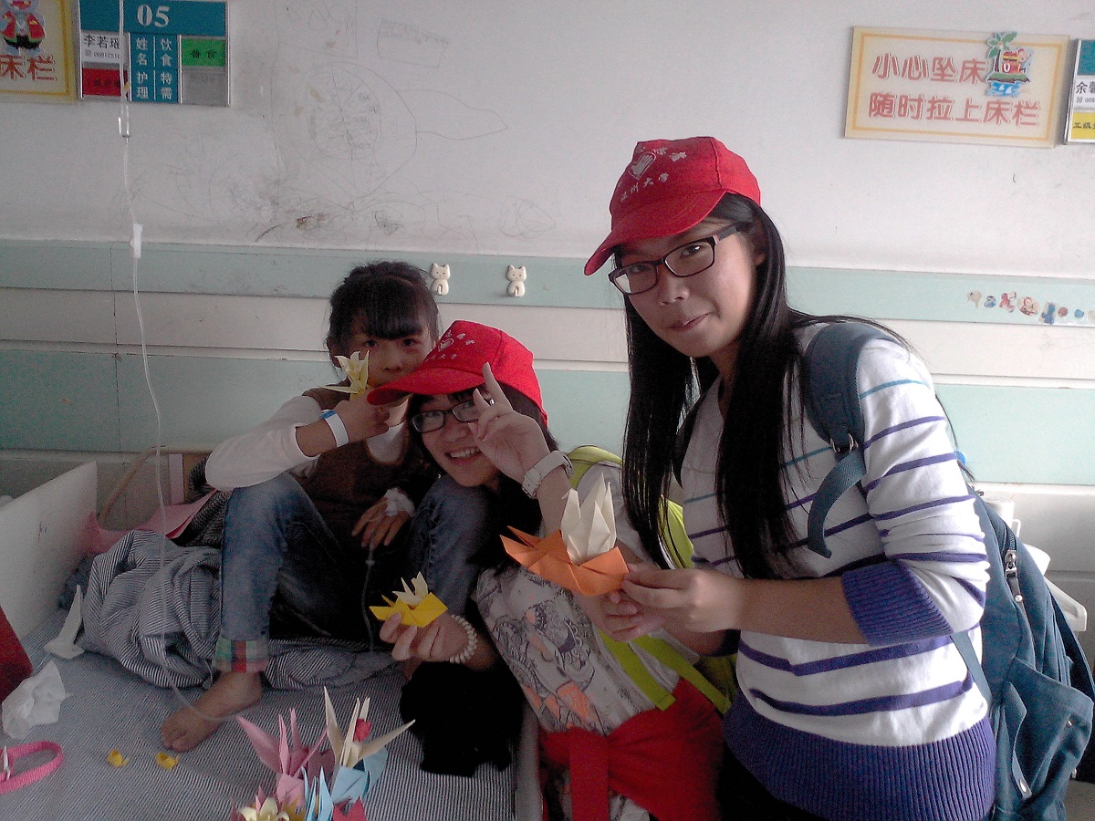 13:20左右,所有志愿者到达了附二医。首先,志愿者们和医院的负责人取得了联系。由医院的负责人为志愿者分配需要陪护的孩子,不一会儿,各个志愿者头戴志愿者小红帽进入不同病房开始了一下午的陪护儿童活动。这次陪护的儿童年龄普遍偏小,但是志愿者们没有为此感到烦恼,他们用微笑和真诚取得了小朋友的信任,有的志愿者教小朋友折纸,有的志愿者教小朋友画画,还有的志愿者和小朋友下起了飞行棋。他们给小朋友们讲笑话、与小朋友们对话、一起玩游戏。时间在欢笑中流逝,许多小朋友还玩得意犹未尽,可志愿者们已经到了该返校的时候。由最开始的陌生害羞到最后的依依不舍,志愿者们与各个自己对应的小朋友们互相道别,然后所有志愿者在门口头戴志愿者小红帽、手拿队旗进行了一次集体大合照来结束此次附二医儿童病房陪护之行。