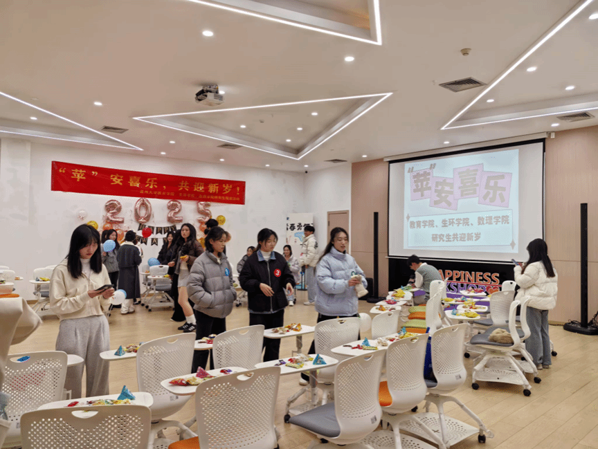 年关将至,为促进学院间交流互动,营造良好的研究生文化氛围,我院联合教育学院、数理学院研究生会于 2024 年12月22日在幸福工坊举办“‘苹’安喜乐,共迎新岁”联谊活动。