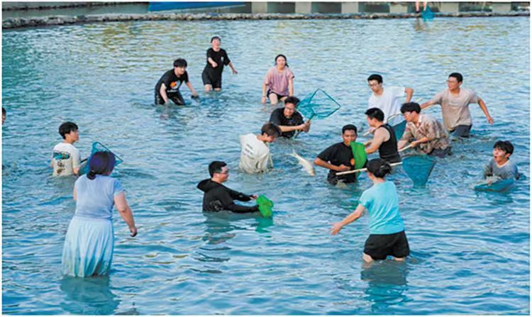 温大师生捕鱼现场。 图片由学校提供“我们一共捕了130斤的鱼,单只最重6斤,第二天还吃到免费的丰盛鱼宴,这样的劳动课真是有滋味。”近日,温州大学第三届捕鱼节暨劳动教育实践活动在明心湖劳动教育基地举行,吸引300多名温大师生、校友热情参与。活动当天,明心湖宛如被按下“欢乐开关”,全校各学院的师生脚穿溯溪鞋,手持抄网,迫不及待开始“捕鱼大战”。下水后,师生们迅速进入状态:有的三两成群,默契配合围堵逃窜的鱼儿,一人负责惊扰、...