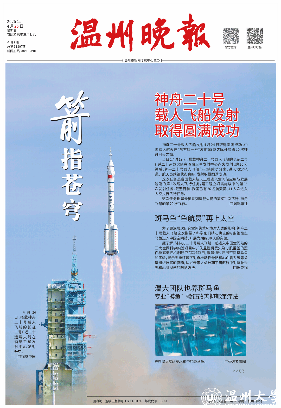 4月24日17时17分,神舟二十号载人飞船在第十个“中国航天日”领命出征,载着斑马鱼、涡虫和链霉菌驶向太空。在温大生命与环境科学学院生研院,斑马鱼生物医学研究团队致力斑马鱼资源开发与生物医学检测技术研发多年,看着自己的“实验伙伴”斑马鱼再次成为“太空明星”,团队人员欣喜非常。“最好的实验伙伴”在神舟二十号载人飞行任务新闻发布会上,中国载人航天工程新闻发言人、中国载人航天工程办公室副主任林西强介绍神舟二十号任务将以斑马鱼、...