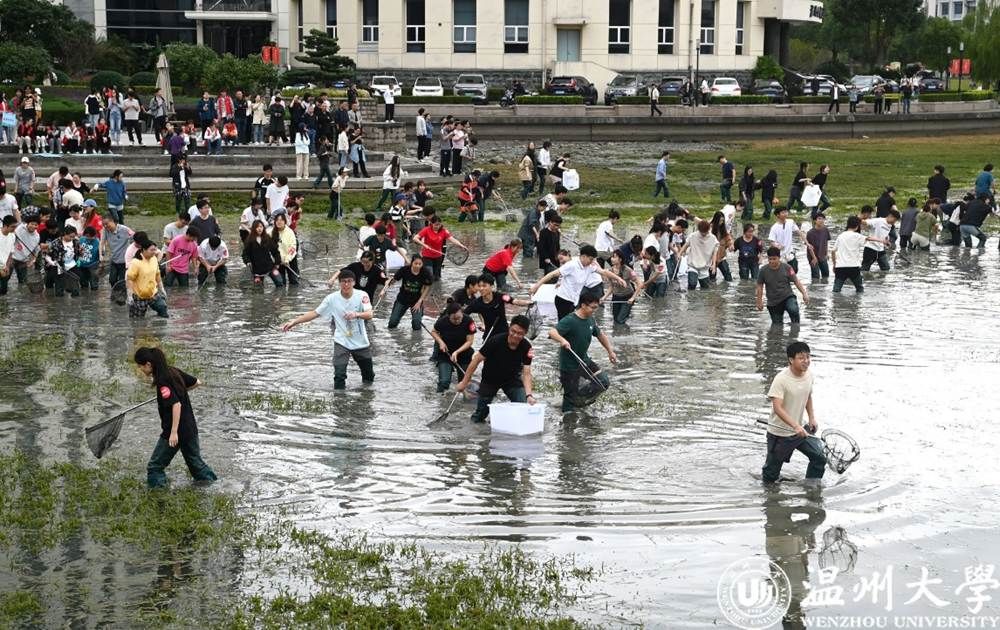 “我宣布!温州大学第二届捕鱼节,开渔咯!”一声令下,超两百位穿戴整齐的“捕鱼达人”蜂拥入水,俯身抓鱼,场面好不热闹!近日,温州大学生命与环境科学学院在明心湖举办了一场别开生面的捕鱼活动,超两百名温大师生热情参与,共同上演了一场妙趣横生的“摸鱼”大戏。随着明心湖水面缓缓下降,岸边早已整装待发的师生们迫不及待地冲入水中,湖面瞬间热闹了起来,草鱼、罗非鱼等纷纷被抓入鱼桶中,岸边的师生也举起手机记录下这壮观的一幕。...