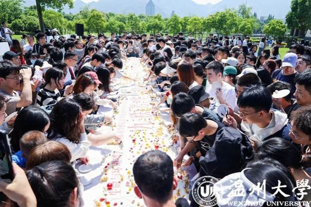 晚报讯时值温州大学90周年华诞到来之际,昨天上午9:33,温州大学生命与环境科学学院在学校“HelloWZU”草坪上举行了一堂生动开放的专业实践教育课。现场,温州大学 90位师生代表共同制作9米长巨型蛋糕,献礼温州大学90周年华诞。巨型蛋糕由该学院的师生全程参与前期烘焙,充分运用了蛋清蛋白质发泡等生物专业知识。师生们将烘焙课堂从实验室搬到户外大草坪,结合自身专业学以致用、知行合一,以专业实践的劳动成果致谢母校、献礼母校,...
